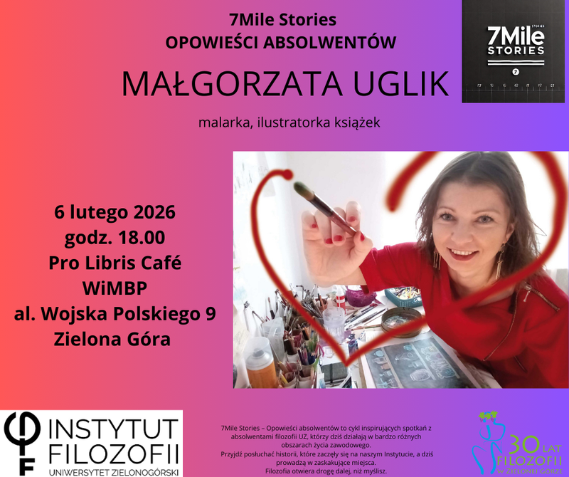 Tym razem naszym gościem będzie Małgorzata Uglik – malarka i ilustratorka książek, absolwentka filozofii, która opowie o swojej drodze zawodowej oraz o tym, jak studia filozoficzne wpłynęły na jej sposób myślenia, tworzenia i pracy twórczej.