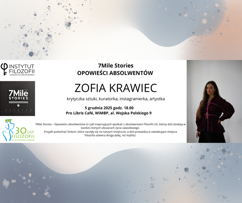7Mile Stories – Opowieści absolwentów to seria wyjątkowych spotkań z osobami, które ukończyły filozofię na Uniwersytecie Zielonogórskim, a dziś realizują się w wielu różnych branżach: od kultury i edukacji, przez biznes i media, aż po sektor publiczny i działalność społeczną.