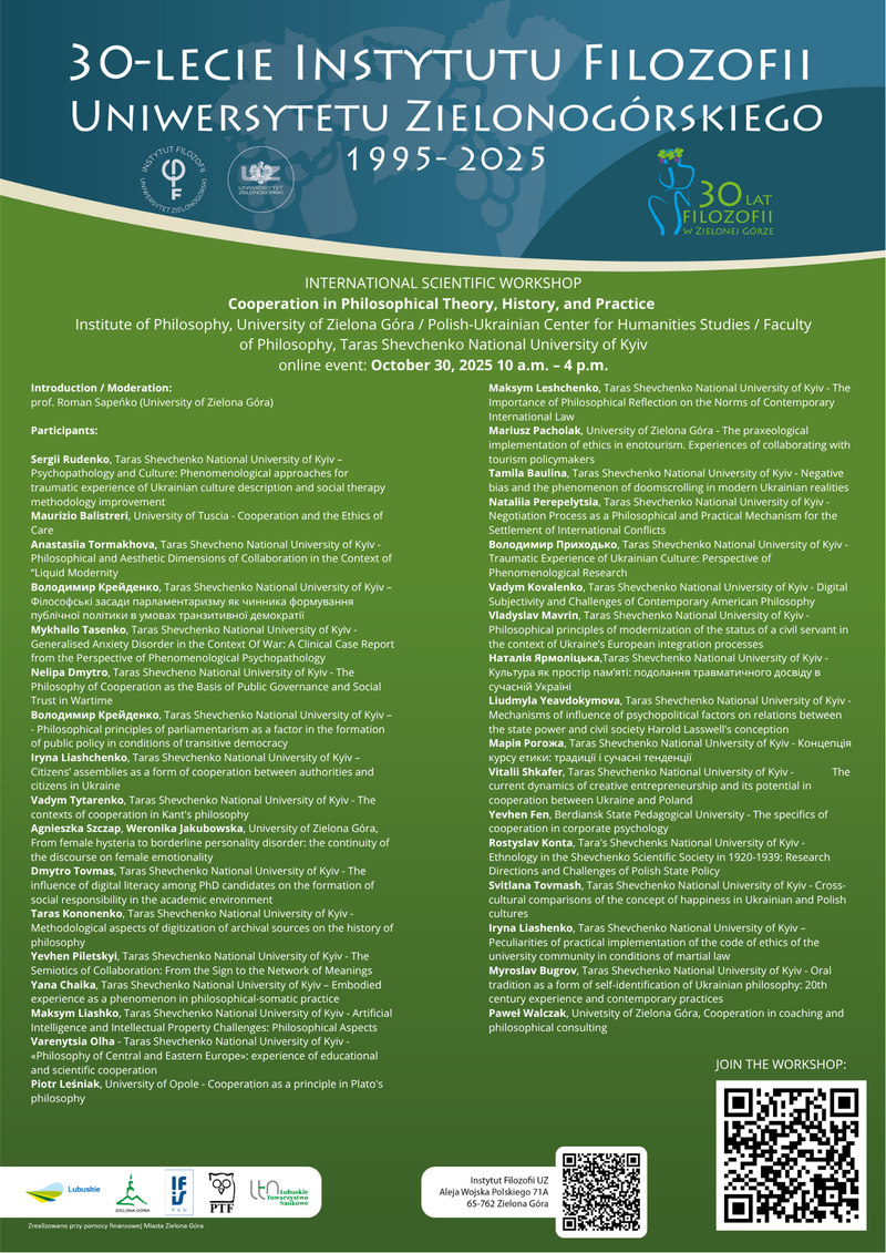 The workshop is a continuation of the conference “Cooperation in Philosophical Theory, History, and Practice”, whose in-person sessions took place on October 23–24, 2025 at the Institute of Philosophy, University of Zielona Góra.