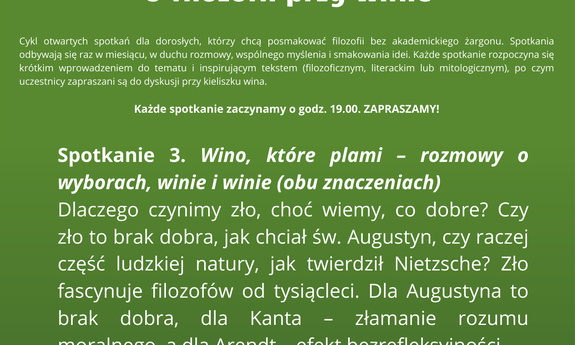 Zapraszamy na trzecie spotkanie z cyklu „O filozofii przy winie". Tym razem zgromadzeni na spotkaniu porozmawiają o wyborach, dobru, złu i winie.