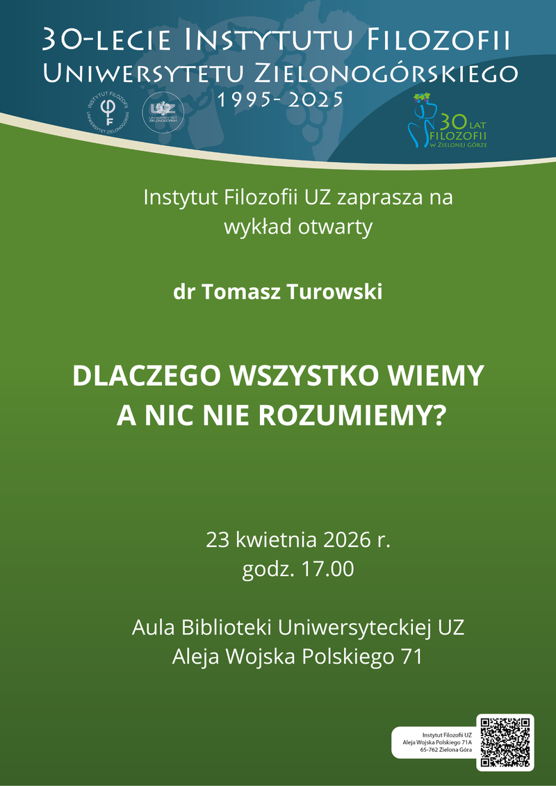 Zapraszamy na kolejny wykład otwarty z okazji 30-lecia Instytutu Filozofii Uniwersytetu Zielonogórskiego. Już w najbliższy czwartek wykład wygłosi dr Tomasz Turowski.